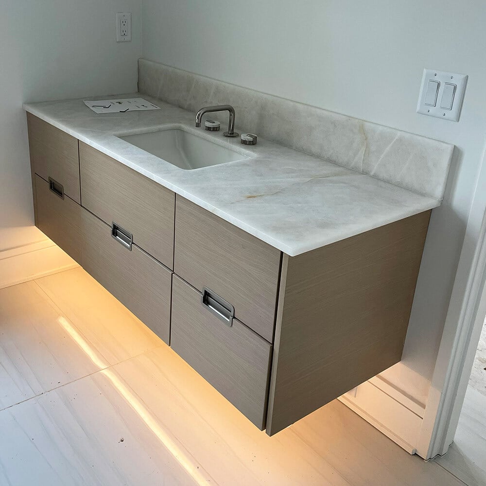 We only work with the finest materials—oak, maple, and solid wood—not particle board or cheap imitations. Our cabinets, vanities, countertops, and shower panels are built in-house, made to order with expert craftsmanship and attention to detail. You’ll see and feel the difference in every finish.